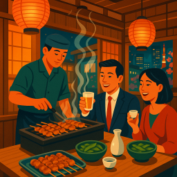 * Jetzt kann Peter das Abendessen mit seinen Freunden im Makitori Shinkōbe Minato City genießen!