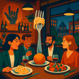 * Jetzt kann Peter das Abendessen mit seinen Freunden im Mano Cornuto Montréal genießen!