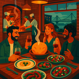 * Jetzt kann Peter das Abendessen mit seinen Freunden im Mediterranean Exploration Company Portland genießen!