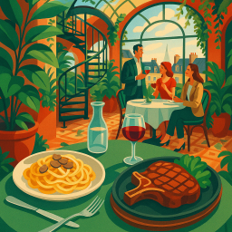 Wonderful setting, service, & food. Felt very special. We shared salads and pizzas, & a flaming!!! creme brulee. Highly recommend!