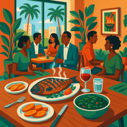 * Jetzt kann Peter das Abendessen mit seinen Freunden im Restaurant Diet Santé, Douala genießen!