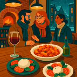 * Jetzt kann Peter das Abendessen mit seinen Freunden im Restaurant Moccione Montréal genießen!