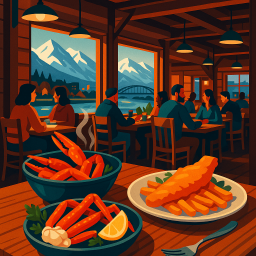 Service was excellent, but what I really loved was the crab legs on the starter bar. Very fresh,tasty and easy to open. They are all you can eat!My halibut dinner was fresh and prepared perfectly.The views of ship creek don't get any better eith