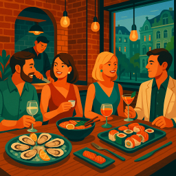 * Jetzt kann Peter das Abendessen mit seinen Freunden im The Catch Rīga genießen!